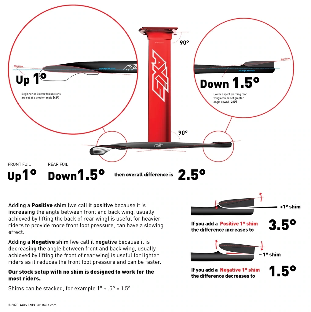 Adding a Positive shim (we call it positive because it is increasing the angle between front and back wing, usually achieved by lifting the back of rear wing) is useful for heavier riders to provide more front foot pressure, can have a slowing effect.