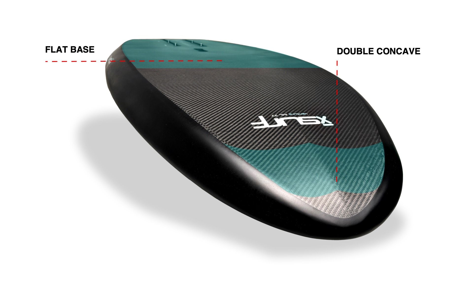 The double concave washes out around 1/3rd of the way into the board and blends perfectly into the flat base ideal for generating speed achieving flight