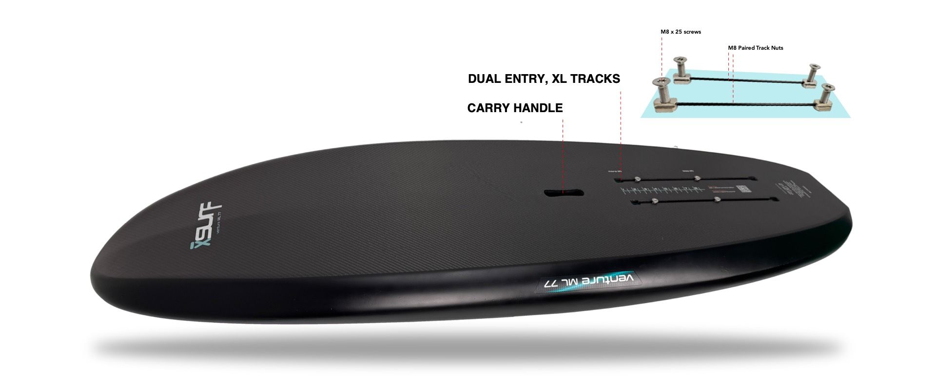 DUAL ENTRY, XL TRACKS – this dual entry allows the use of our Paired Nuts without compromising foil placement options. The XL length (42cm) ensures the perfect placement for any brand or type of foil. The unique construction of our tracks allows for longer tracks without creating a flat spot in the rocker