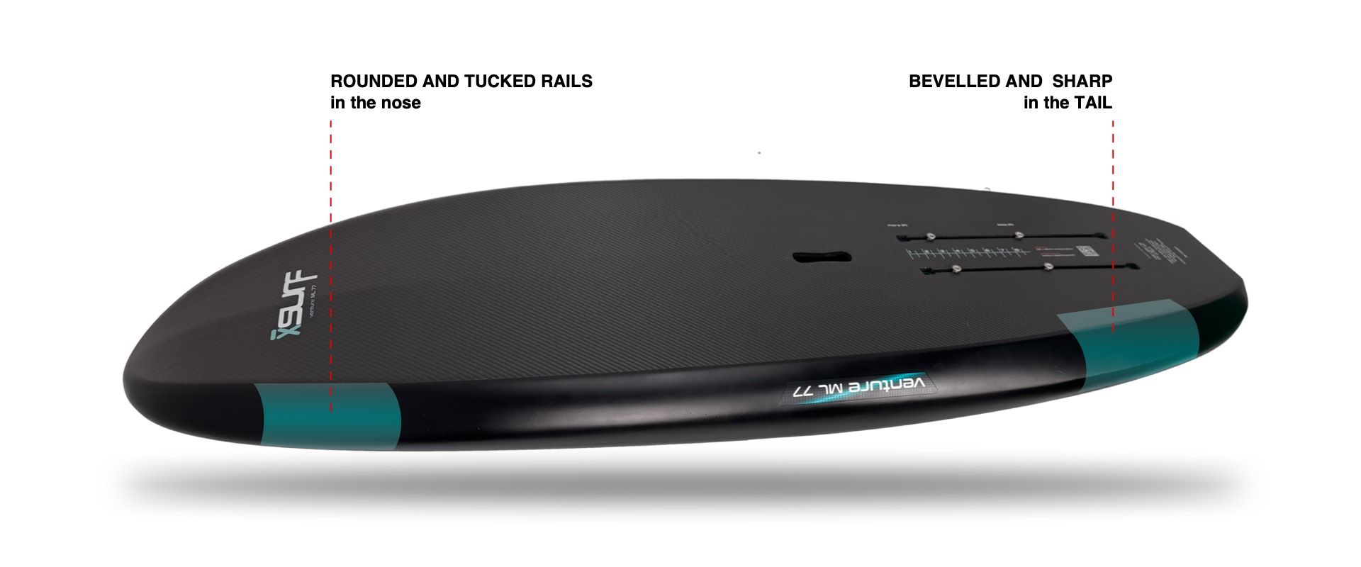 The rounded nose rails avoid grabbing both on take-off and touching downs whilst the rear bevels and hard edges allow a clean water release at near planning speeds and prevent unwanted rail grabs when wave riding or aggressively turning.